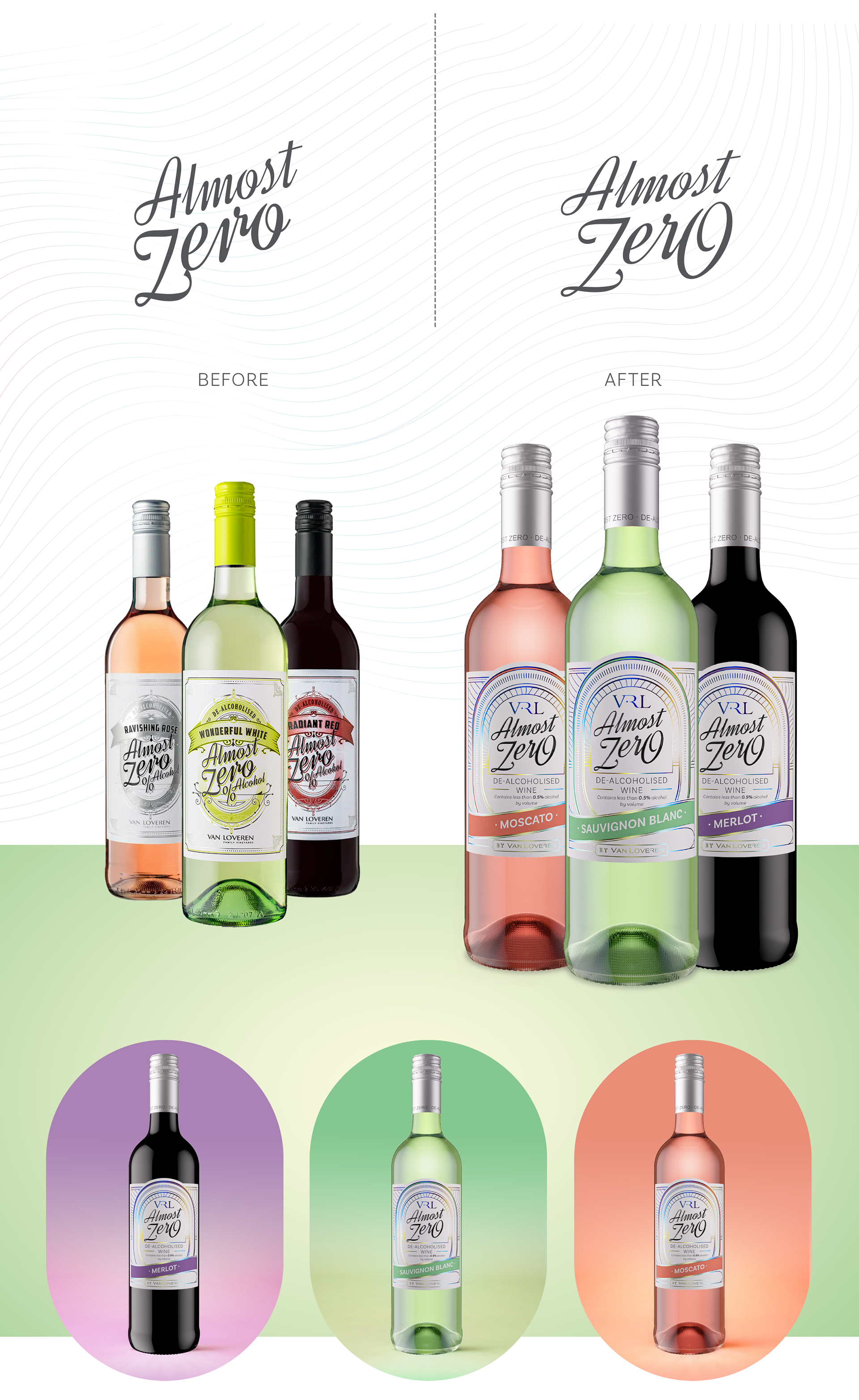 Almost Zero was launched in 2020 at the outset of Covid (during the SA alcohol ban) and holds the number one position in the South African non-alcoholic wine category. Almost Zero was first to market when a category packaging style was not yet established in the local market. Almost Zero’s craft beer label image was initially beneficially disruptive, easily setting it apart from wines containing alcohol. However, as the category matured, this distinctive look has dated and lacks the finesse sober curious consumers are seeking for enjoyment at adult drinking occasions.